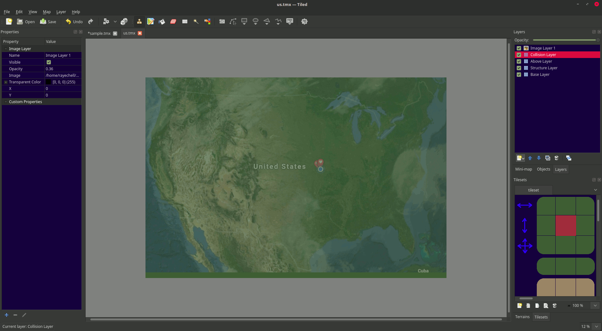 At first my U.S. Tiled map wasn't working in Ezha, and then I saw a "TODO: Implement support for 2D tilesets". Oops. I've done this before, but I guess earlier I only implemented the bare minimum in the free time I had. All I had to do was calculate the coordinates of the tile in the tileset like this: